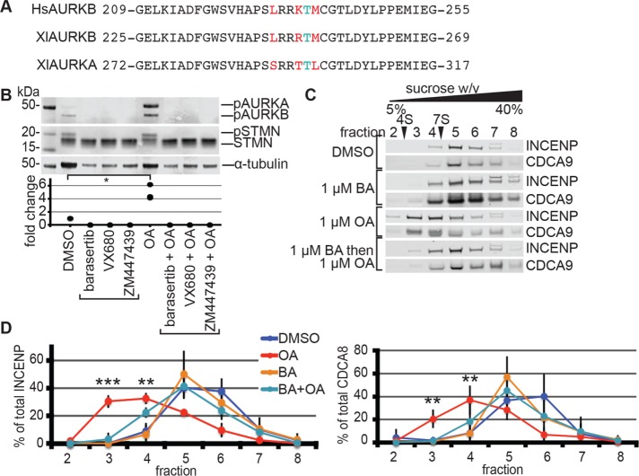 FIGURE 1:. Phosphatase inhibition activates AURKB and causes a change in the hydrodynamic properties of its associated protein complex. (A) Sequences of the activation loop of human and X. laevis AURKB and X. laevis AURKA. Differences are highlighted in red, and the key phosphorylated threonine is highlighted in turquoise. (B) Mitotic HSS was incubated with kinase inhibitors and okadaic acid. Equal reaction volumes were run on an SDSâPAGE gel and immunoblotted with antibodies against pT232-AURK (which recognizes AURKA, AURKB, and AURKC phosphorylated at the conserved threonine on the activation loop of the kinase), STMN, and α-tubulin. The blot was quantified by normalizing pAURKB intensity to α-tubulin intensity and set such that the lowest value of each replicate was the DMSO control (lanes where no intensity could be detected are marked as zero). The p value between the DMSO and okadaic acid samples is 0.014; n = 3. (C) Mitotic HSS was incubated with kinase inhibitor or DMSO for 25 min, followed by okadaic acid or DMSO for an additional 25 min. Equal volumes were sedimented on 5â40% sucrose gradients for 6 h at 237,000 à g and 4°C. The indicated fractions were separated on SDSâPAGE gels and immunoblotted with antibodies against INCENP and CDCA9. The identity of the higherâmolecular weight band in higher-numbered INCENP blots is unknown but likely corresponds to a posttranslationally modified version of INCENP. Full blots with molecular weight markers are given in Supplemental Figure S1. (D) Sucrose gradient blots in C were quantified and normalized to the total amount of the indicated protein in the gradient. Error bars represent SD. The p values indicated by asterisks were calculated between the barasertib- and okadaic acidâtreated samples in fractions 3 (INCENP 0.00046, CDCA9 0.0075) and 4 (INCENP 0.0057, CDCA9 0.0062); n = 4. |