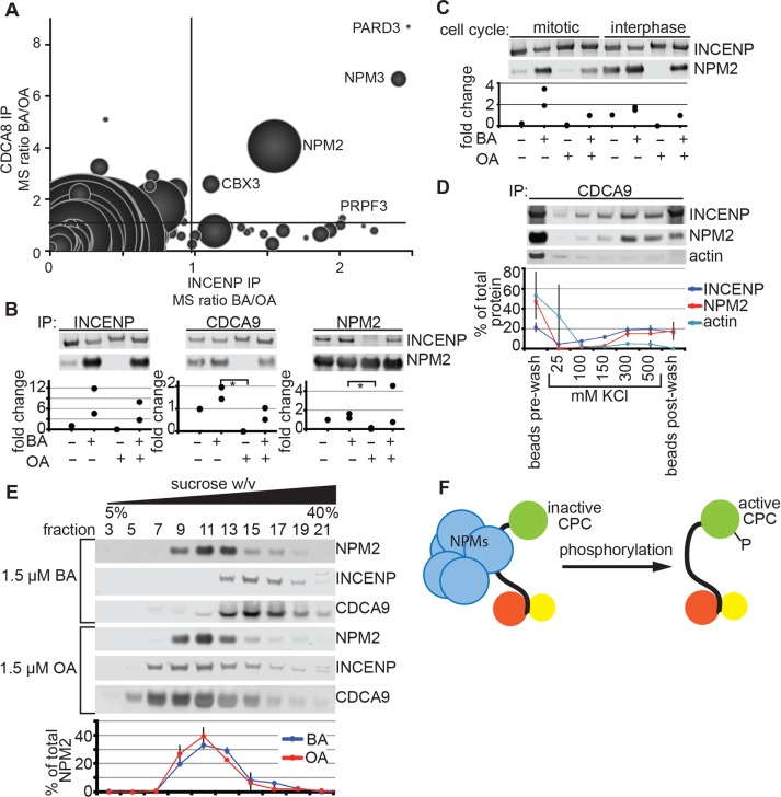FIGURE 5:. NPM2 interacts with inactive CPC. (A) CPC proteins were immunoprecipitated from mitotic HSS and analyzed via quantitative mass spectrometry. Protein counts were normalized to IgG IPs and the target protein (INCENP or CDCA9). Ratios for each protein were generated by dividing reporter ion counts from barasertib-treated samples by counts from okadaic acidâtreated samples. Proteins with a ratio >1 (gridlines on plot) indicate enrichment in barasertib-treated samples over okadaic acidâtreated samples. Labeled proteins are those with ratios >1 in both CDCA8 and INCENP IPs. Size of bubbles is proportional to the measured amount of protein in X. laevis extract (Wuhr et al., 2014). Full lists of proteins and ratios are given in Supplemental Table S1. (B) Mitotic HSS was incubated with barasertib (BA), okadaic acid (OA), both, or neither as in Figure 1. Beads loaded with antibodies against X. laevis INCENP, CDCA9, and NPM2 were used for immunoprecipitations from treated mitotic HSS, and then the proteins on the beads were blotted with antibodies against INCENP and NPM2. Blots were quantified by dividing levels of the blotted protein by levels of the IP target protein. Fold change represents change in NPM2 levels (INCENP and CDCA9 IPs) or INCENP levels (NPM2 IP) after intensities were normalized by setting the DMSO lane to 1. Values of 0 indicate no detectable intensity. The p values between the BA and OA samples indicated by the asterisk are 0.029 (CDCA9 IP) and 0.043 (NPM2 IP); n = 2. Full blots, including molecular weight markers, are given in Supplemental Figure S6. (C) Crude X. laevis extract was cycled into interphase with the addition of calcium, and both mitotic and interphase extract were treated with drugs as in B. Beads loaded with antibody against CDCA9 were used for immunoprecipitation and immunoblotted for INCENP and NPM2. NPM2 blots were quantified as described, normalized to INCENP, and with the lane treated with both drugs set to 1. Full blot including molecular weight markers is given in Supplemental Figure S7. (D) The CPC was immunoprecipitated from mitotic HSS using the antibody raised against CDCA9. After four quick low-salt washes, beads were incubated in solutions of increasing salt for 5 min each. The proteins bound to the beads before and after the salt washes, as well as those in the entire volume of each salt wash, were separated via SDSâPAGE and protein levels analyzed by immunoblots of INCENP, NPM2, and actin. Protein levels were quantified as a percentage of the total of that protein. Error bars represent the SD; n = 2. Full blots including molecular weight markers are given in Supplemental Figure S8. (E) Sucrose gradients of barasertib (BA)- or okadaic acid (OA)âtreated mitotic HSS were run as in Figure 1, except that fractions were one-third smaller. Every other fraction was immunoblotted for NPM2, INCENP, or CDCA9. NPM2 blots had 7.5 times less total protein concentration in each lane. NPM2 blots were quantified as in Figure 1. Error bars represent SD; n = 2. Full blots including molecular weight markers are given in Supplemental Figure S9. (F) Proposed model for phosphorylation-induced CPC hydrodynamic changes (CPC proteins: AURKB green, INCENP black line, CDCA8/9 orange, BIRC5 yellow). Pentameric or decameric NPM oligomers (blue) interact with the CPC when the CPC is inactive and unphosphorylated. This interaction may involve direct binding or be mediated by other proteins. When phosphatases are inhibited, NPMs dissociate and the CPC is activated. |