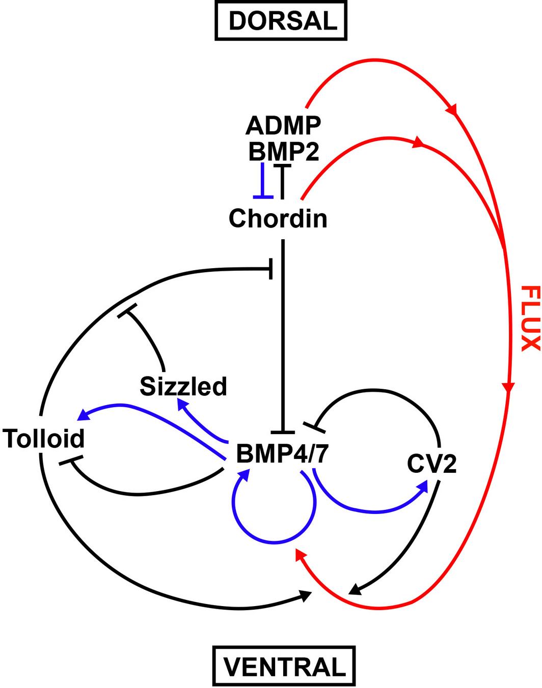 The Chordin/Tolloid/BMP morphogenetic pathway. This pathway patterns the D-V axis of the Xenopus gastrula. A self-regulating gradient of BMP activity results from direct protein–protein interactions between Chordin and other partners, indicated by black lines. Blue arrows indicate transcriptional regulation by BMP signaling, which is maximal in the ventral and lowest in the dorsal center. Red arrows indicate protein flux of Chordin-BMP complexes in a narrow signaling highway located in the extracellular matrix that separates the ectoderm from the endomesoderm. Tolloid constitutes the rate-limiting step, serving as a Chordin proteinase. Note that BMPs have a dual regulatory activity on Tolloid metalloproteinase: they stimulate Tolloid (Xlr) transcription, and they inhibit Tolloid enzymatic activity non-competitively by binding to the CUB domains. Sizzled is a competitive inhibitor of Tolloid that is bound by the active site but not cleaved.