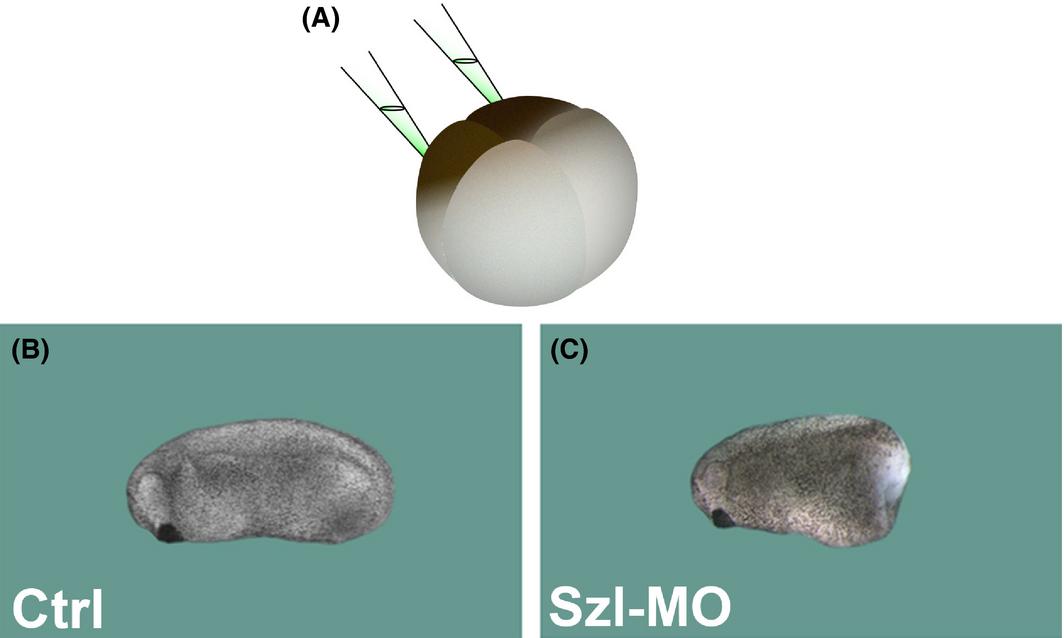 Depletion of Sizzled on the ventral side results in embryos with expanded ventral-posterior structures and normal heads. (A) Schematic diagram showing targeted injection of Sizzled antisense Morpholino into the ventral blastomeres of a four-cell Xenopus embryo. (B,C) Injected and control embryos were collected at stage 25 and analyzed for phenotype; five independent experiments. All controls (n = 150) developed normally. Ventrally targeted Sizzled depletion promoted enlargement of ventro-posterior tissues, while leaving the anterior tissues unaffected. This phenotype was observed in 94% of the Szl-MO injected embryos (n = 117). Compare to Figure 1.