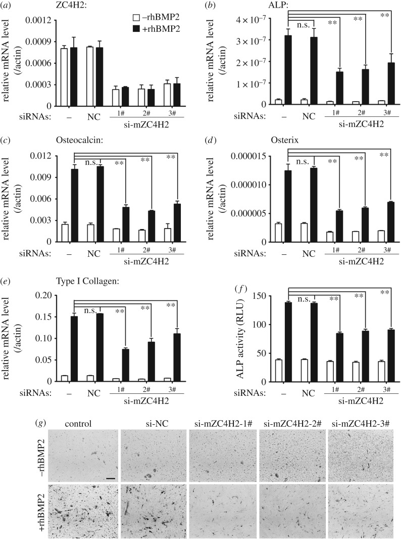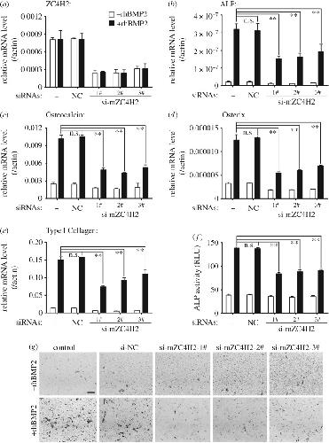 Figure 5. ZC4H2 is required for BMP induced osteogenic differentiation in C2C12 cells. (a) ZC4H2 mRNA level in C2C12 cells with different siRNAs transfected during BMP-induced osteogenic differentiation. C2C12 cells were transfected with negative control or three independent siRNAs targeted for ZC4H2 and then were treated with 50 ng ml−1 rhBMP2 for 3 days to induce osteogenic differentiation. Then total RNAs were isolated and real-time PCRs were carried out. (b–e) ZC4H2 knockdown decreased the expression levels of BMP induced osteogenic markers ALP (b), Osteocalcin (c), Osterix (d) and Type I Collagen (e). The experiments were carried out as described above for panel (a). (f,g) ZC4H2 knockdown reduced rhBMP2-induced ALP activity in C2C12 cells. C2C12 cells were treated for osteogenesis as described above in panel (a) after the indicated siRNAs were transfected. After induction, ALP activity was analysed by an ALP fluorometric kit (f) or NBT/BCIP staining (g). NC, negative control. n.s., not significant; **p < 0.01. |