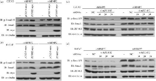 Figure 9. ZC4H2 stabilizes Smad proteins in vivo. (a,b) ZC4H2 overexpression stabilized Smad proteins in C2C12 (a) and HeCaT (b) cells. C2C12 or HeCaT cells were transiently transfected with the indicated plasmids and treated with rhBMP2 or not for 24 h before harvesting. Cell lysates were analysed by western blotting. (c,d) ZC4H2 knockdown reduced Smad proteins in C2C12 (c) and HeCaT (d) cells. For knockdown of ZC4H2, three independent siRNAs against mouse or human ZC4H2 were transfected into C2C12 or HeCaT cells, respectively. Cells were treated for 24 h with rhBMP2 and harvested at 72 h after transfection. Cell lysates were analysed by western blotting. NC, negative control; IB, immunoblotting. |