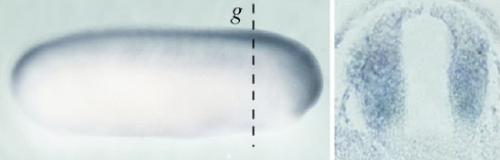 zc4h2 (zinc finger, C4H2 domain containing) gene expression in Xenopus laevis embryo, assayed via in situ hybridization, NF stage 27, lateral view, anterior right, dorsal u, and the neural tube in transverse section, and level of g, dashed line. |