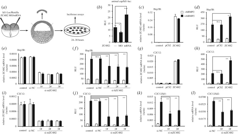 Figure 2. ZC4H2 regulates BMP signalling. (a,b) The effect of ZC4H2 knockdown or overexpression on the expression of the BMP reporter Id1-Luc in Xenopus animal caps. (a) Schematic drawing showing the experimental strategy for reporter assays in Xenopus animal caps. Embryos were injected with the indicated MO/mRNAs/plasmids in both blastomeres at the two-cell stage and the animal cap tissues were dissected at stage 8 and then were cultured for 20â24 h before harvesting. RLU, relative light units. *p < 0.05. (câj) ZC4H2 over-expression enhanced while knockdown reduced rhBMP2-induced expression level of Id1-Luc reporter in Hep3B (câf) and C2C12 cells (gâj). Note that BMP treatment has no effect on either exogenous and endogenous ZC4H2 mRNA levels in both the cell lines (c,e,g,i). Hep3B or C2C12 cells were transfected with the indicated plasmids or siRNAs together with Id1-Luc reporter plasmids and then treated with rhBMP2 for 24 h. Luciferase activity was measured at 48 h after transfection. RLU, relative light units. n.s., not significant. *p < 0.05; **p < 0.01. NC, negative control. (k,l) ZC4H2 knockdown in C2C12 cells decreases mRNA levels of Id1 (k) and Id2 (l) induced by rhBMP2. C2C12 cells were transfected with the indicated siRNAs and treated with rhBMP2 for 24 h before harvesting. Total RNA was extracted for real-time PCR analysis at 72 h after transfection. **p < 0.01. NC, negative control. |