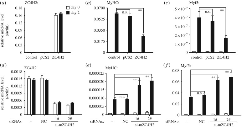 Figure 3. ZC4H2 inhibits myogenic differentiation of C2C12 cells. (a–c) mRNA levels of ZC4H2, myogenic markers MyHC and Myf5 during myogenic induction in C2C12 cells with ZC4H2 over-expressed. C2C12 cells were firstly transfected with the indicated plasmids 8 h before myogenic induction in DMEM with the addition of 2% horse serum for 2 days. After induction, total RNAs were isolated and analysed by real-time PCR. (d–f) mRNA levels of ZC4H2, myogenic markers MyHC and Myf5 during myogenic induction when ZC4H2 was knocked-down. C2C12 cells were transfected with the indicated siRNAs and then treated with the induction medium for 2 days. The experiments were carried out as described for panel (a–c). n.s., not significant; **p < 0.01. NC, negative control. |