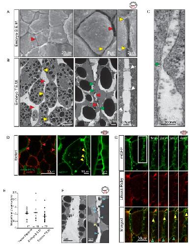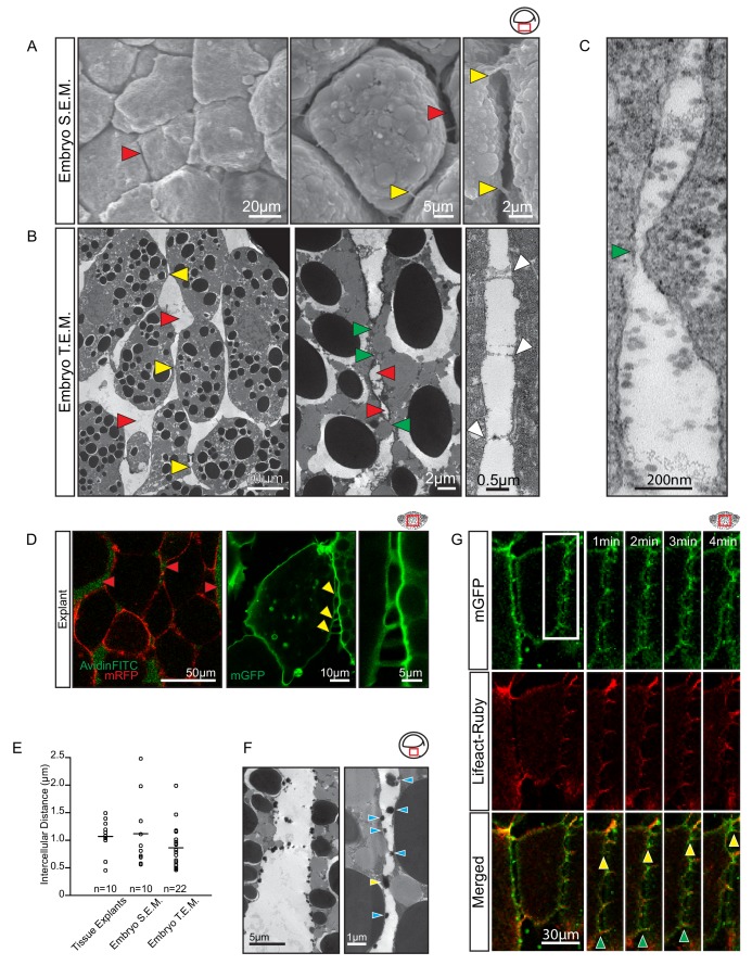 Figure 5. Vegetal endoderm cells migrate through wide interstitial spaces.(A) SEM of endoderm in embryos. Overview (left). High magnification (center) reveals interstitial spaces between cells (red arrows). Cells are linked by stitch contacts (right; yellow arrows). (B) TEM of endoderm in embryos. Overview (left), cell gaps (3- or 4 cell junctions; red arrow) and cell–cell contacts (yellow arrow) are indicated. Higher magnification (center) show contacts (green arrows) interspersed between gaps (red arrows). Base of stitch contacts appear raised (white arrows), indicating tethers are taut (right). (C) A cell-cell contact (green arrow) compatible with cadherin-based adhesion (~30 nm). (D) Interstitial gaps in explants. Labelled (mRFP) explants (left) in medium with AvidinFITC to visualize gaps (red arrows). Stitch contacts (yellow arrows) extend between cells (center). Magnified view of contacts (right). (E) Quantification of intercellular distance in explants, whole embryo SEM, and TEM. Measurements were taken from the central, mid-endodermal region. (F) Interstitial gaps contain extracellular matrix. Putative heteroglycans stained using Alcian Blue appear as black cell surface residues under TEM (blue arrows) or link cells (yellow arrow). Plot shows data cumulatively sampled from four embryos collected from different egg batches. (G) Cells form dynamic intercellular contacts. Membrane label (mGFP; top) and Lifeact-Ruby (middle) co-expressing cells show contacts containing F-actin (merged; bottom). Time-lapse sequence (four right panels) of a region of interest (box) shows that protrusions extend (yellow arrows) and retract (green arrows). Region of interest (red box) is indicated in the top right corner of select panels.10.7554/eLife.27190.017Figure 5—source data 1. Quantification of intercellular distance. |