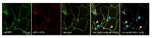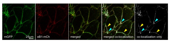 Figure 9âfigure supplement 2. Co-localization of ephrinB1 (eB1-mCh) with membrane-label (mGFP) shows that ephrinB1 is dispersed over the entire membrane, but enriched at the trailing edge membrane (yellow arrows), particularly at the rear (blue arrows).Individual images are shown alongside the merged image. From left to right, the images represent mGFP only, eB1-mCh only, merged composite, a co-localisation rendering showing sites of co-localisation in white (white areas) superimposed on a composite image of mGFP and eB1-mCh, and a co-localisation-only panel, with the composite image removed for clarity. |