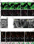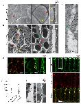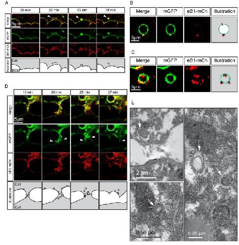 Figure 10. Macropinocytosis, trans-endocytosis and cell detachment.(A) Macropinosome formation. Sequence shows membrane undulations of an eB1-mCh and mGFP co-expressing cell at the trailing edge. A membrane indentation is pinched off to form an endosome (arrows). Separate panels are shown for mGFP and eB1-mCh, an interpretation of the process at the bottom. (B) Single membrane vesicle. A vesicle in the trailing edge cytoplasm of an eB1-mCh and mGFP co-expressing cell shows eB1-mCh at the outside. An interpretative illustration is shown (right). (C) Double membrane vesicle. A vesicle located in the trailing edge cytoplasm of an eB1-mCh and mGFP co-expressing cell shows label on both sides of the vesicle membrane. An interpretation is shown (right). (D,E) Membrane endocytosis during cell-cell contact resolution. (D) Sequence shows cell detachment of mGFP and ephrinB1-mCh co-expressing cells. A leader cell (upper) resolves its contact (arrows) with a follower (lower) cell. Composite and individual channels are shown. Numerous vesicles are seen at the site of contact during detachment in the leading cell. An interpretation of the process is shown (bottom). (E) TEM of putative trans-endocytotic vesicles. (i) A leading cell presumably undergoing membrane trans-endocytosis as it detaches from a follower cell. A double layered vesicle containing cytoplasmic cargo is indicated (arrow). (ii) Another example of a cytoplasm-filled vesicle within a vesicle (arrow) in the trailing edge cytoplasm. (iii) Various vesicles (arrows) within the trailing edge cytoplasm. |