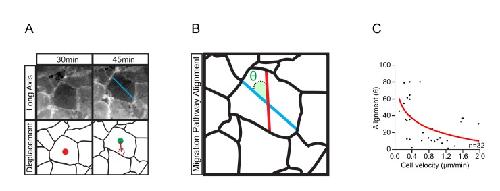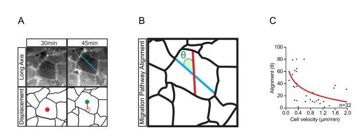 Figure 4—figure supplement 1. Cell translocation is a result of active cell movement and passive drift imposed by surrounding cells.(A) The longitudinal axis of the cell (blue line, top row) which coincides with the direction of active cell movement does not always align with the resultant path of cell displacement (red line, bottom row). Original position (red centroid) of the cell is indicated at 30 min. Cell position after 15 min (green centroid) is indicated at 45 min. Cell displacement from origin to destination is indicated (dashed centroid outline). (B) Trajectory alignment of cell in (A). Deviation of the resultant path (red line) from the intended path (blue line) is represented by alignment angle (θ). Alignment is high when θ is small, or poor when θ is large. Thus, during movement, cells may drift sideways to some extent. (C) Inverse relationship of alignment angle (θ) to cell velocity in explants (i.e. cells with less drift tend to move faster). Fitted curve (red line) is indicated in scatter-plot. Panels show data cumulatively sampled from three embryos collected from different egg batches.10.7554/eLife.27190.013Figure 4—figure supplement 1—source data 1. Quantification of cell alignment with respect to cell velocity. |
