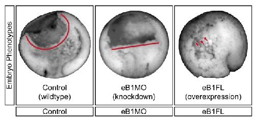 Figure 9—figure supplement 1. Mid-sagittal fractures of stage 12 uninjected (left), eB1MO-injected (centre), and eB1FL mRNA-injected (right) gastrulae.BCF length (red line) and dissociated cells (red arrows) are indicated. |