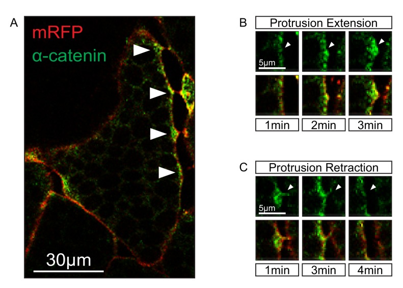 Figure 7—figure supplement 1. Localization of α-catenin.(A) Localization of α-catenin-GFP at sites of cell–cell contact (white arrows). (B) Protrusion extension is correlated with α-catenin accumulation (top row, white arrows). α-catenin enrichment fills protrusions from the tip to the base (bottom row). (C) Protrusion retraction is correlated with α-catenin reduction (white arrows). After complete retraction, α-catenin is diminished in the cortex (bottom row). |