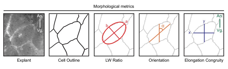 Figure 6—figure supplement 1. Schematic of morphometric analyses.To characterize cell morphology, we analyzed time-lapse recordings of membrane-labelled cells in explants, and in the embryo. For computer-assistant analysis, we first used cell segmentation to identify cell outlines. Segmentation accuracy was manually verified. To find the long-axis of cells, we used the best-fit ellipse to identify the major (a) and minor (b) axes of cells. The cell aspect ratio (a/b) was used to measure the cell body length-width ratio. The long (major) axis of cells were used to determine cell orientation (α) with respect to the animal (An) – vegetal (Vg) axis. To measure the congruence (y/x) of cell elongation relative to the direction of cell migration (along the A-V axis) we measured the corresponding horizontal (x) and vertical (y) cell axes. |