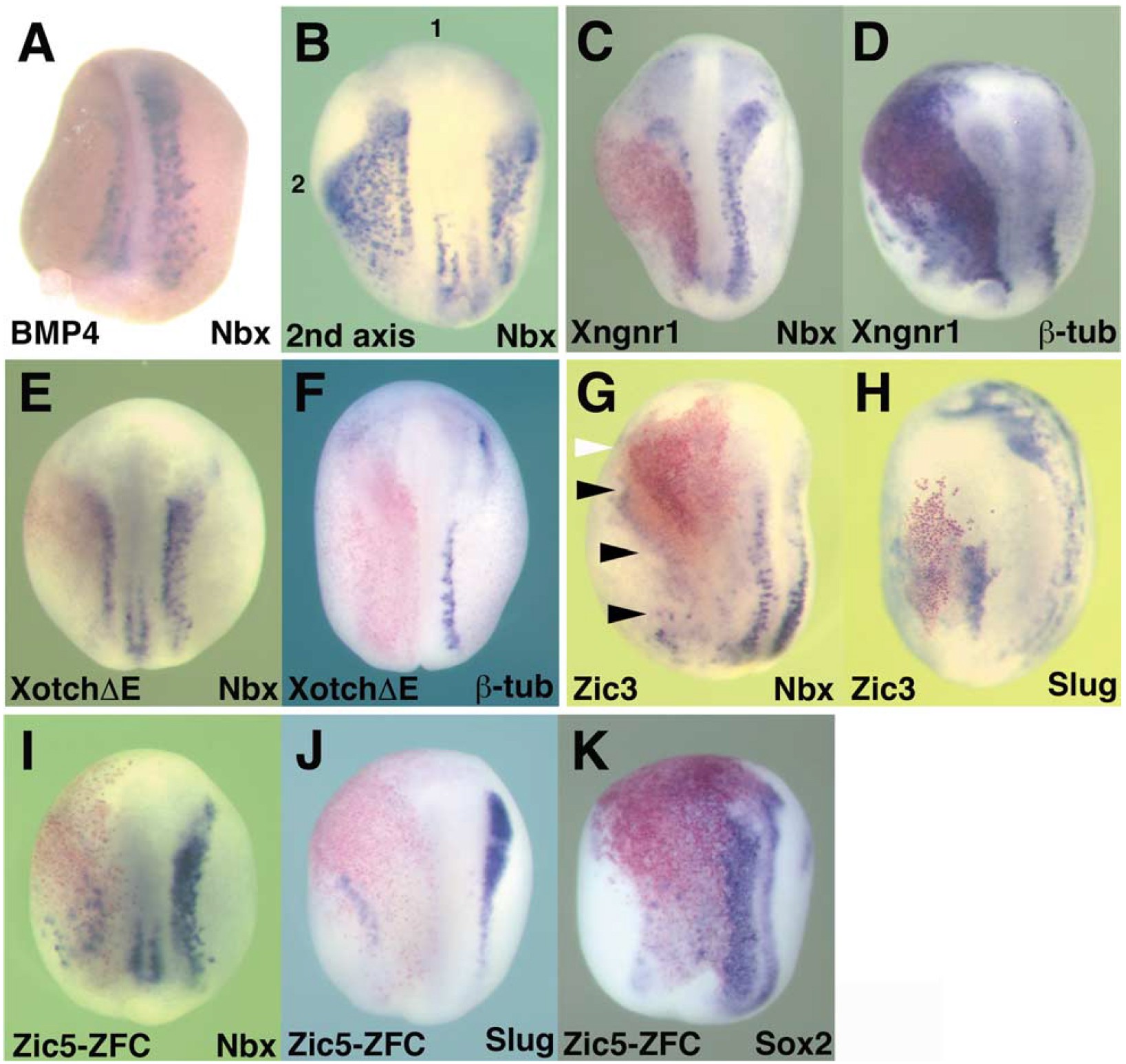 Genes referenced: actc1 b3gat1l bmp4 bmpr1a dll1 gal.2 gsc krt12.4 ncam1 neurog2 nkx1-2 notch1 otx2 snai2 sox2 tubb2b zic3 zic5