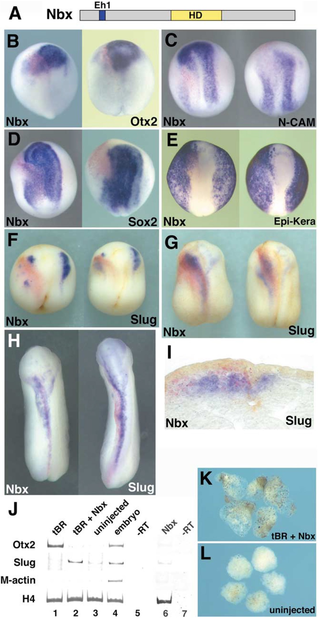 The vertebrate neural crest is formed at the border between the neural plate and nonneural ectoderm during neurulation and eventually gives rise to a variety of cell types, including neurons, glia, facial chondrocytes and osteoblasts, and melanocytes. Although several secreted molecules, such as BMP, Wnts, FGF, and Noelin, have been implicated in neural crest formation, little is known about the precise intracellular mechanism underlying neural crest induction and differentiation. Here, we have identified a novel NK-1 class homeobox gene Nbx in Xenopus whose expression is correlated with neural crest formation. We also found that Nbx harbors an Eh1 domain and is a transcriptional repressor. Overexpression of Nbx suppressed neural plate makers and caused enhanced expression of the neural crest maker Slug. In contrast, the overexpression of a dominant negative form of Nbx during neurula stages suppressed the expression of the neural crest marker Slug and expanded neural markers such as Otx2 and Sox2. Taken together, we propose that Nbx is an essential transcriptional repressor required to permit neural crest induction by inhibiting the neural fate.