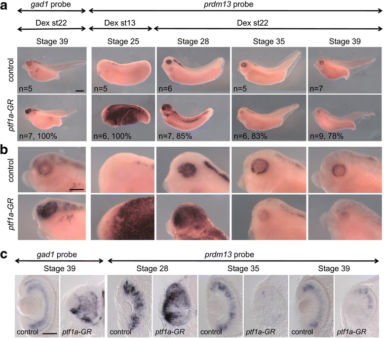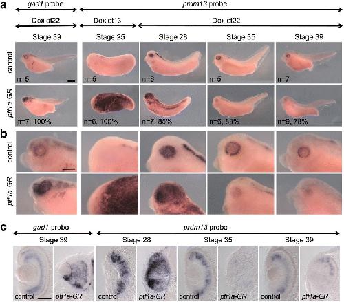 Prdm13 expression is deregulated upon Ptf1a gain of function. Whole-mount in situ hybridization analysis of prdm13 and gad1 expression in ptf1a-GR mRNA injected embryos treated with dexamethasone (Dex) and analysed at the indicated stages. Shown are lateral views of the embryos (a), of the head at higher magnification (b), and transversal sections of the retinas (c). The number of analysed embryos and percentage of embryos with represented phenotype are indicated in each panel. Scale bars represent 400 μm (a, b) or 100 μm (c)