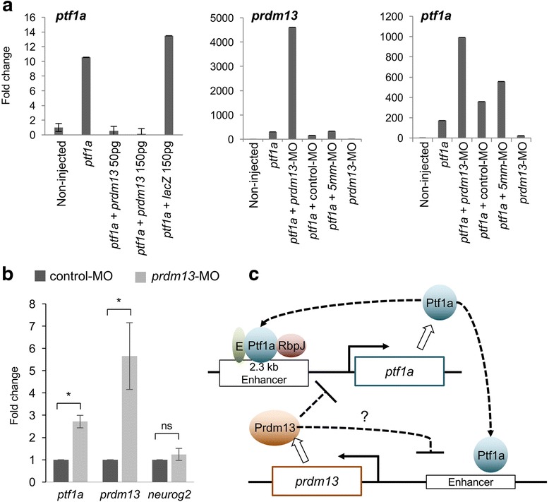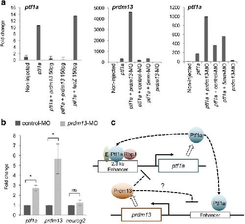 Fig. 7. Prdm13 negatively regulates Ptf1a in a feedback loop. a RT-qPCR analysis of prdm13 and ptf1a expression in animal cap explants isolated from embryos injected with ptf1a-GR, mprdm13, lacZ mRNA and morpholinos as indicated, and collected when sibling embryos reach stage 26. Expression levels in non-injected caps have been set to 1. Shown are representative results of one out of two independent experiments. Data are presented as means of technical triplicates ± SD. b RT-qPCR analysis of ptf1a, prdm13 and neurog2 expression in stage 39/40 dissected eyes from control-MO or prdm13-MO injected embryos. Expression level in control caps has been set to 1. The graph represents a pool of 3 to 4 experiments. Data are presented as mean ± SEM. p < 0.05 (*) (Mann-Whitney test). c Drawing illustrating the interactions between ptf1a and prdm13 suggested by our results. As in the neural tube [22], we found that Ptf1a positively regulates prdm13 expression. It has previously been shown that Ptf1a binds, along with an E protein and Rbpj (PTF1-J complex), to a conserved 2.3 kb sequence located 13.4 kb 5Ⲡto the ptf1a coding region and regulates its own transcription [53]. We showed here that Prdm13 negatively regulates its own expression through a negative retro-control of ptf1a expression. The underlying mechanism remains to be investigated. Our results also do not exclude the possibility that Prdm13 could in addition directly repress its own expression