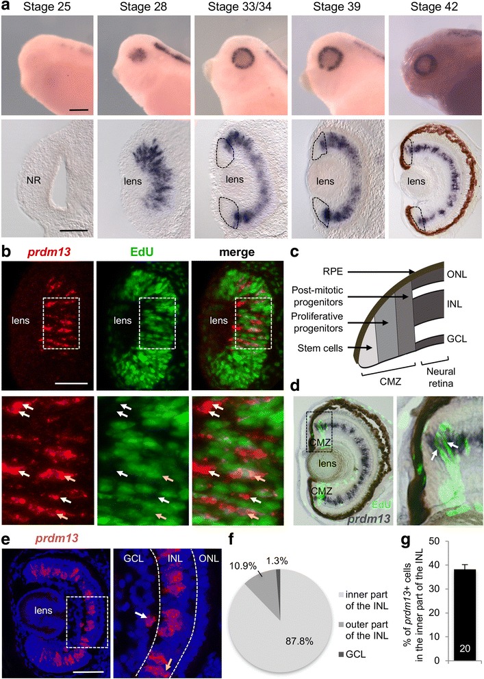 /Eduâ cells while yellow arrows point to double labelled cells. c Schematic of a CMZ in the periphery of a Xenopus tadpoleretina. d Stage 42 retinal section following prdm13 in situ hybridization (dark blue) and EdU incorporation assay (green). Since EdU labels cells that are in the S-phase during the 3-h EdU pulse, not all proliferative cells are labelled, in particular the slowly cycling stem cells. Panel on the right is an enlargement of the area delineated with dotted lines. Arrows point to double labelled cells. e