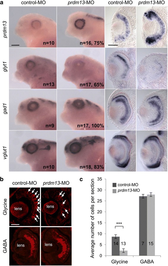 Prdm13 loss of function leads to a decrease in glycinergic but not GABAergic-amacrine cells. a Whole-mount in situ hybridization analysis of prdm13, glyt1, gad1 and vglut1 expression on stage 39/40 embryos injected with prdm13-M0 or control-MO. Lateral views of the head and transversal sections of the retinas are shown. The number of analysed embryos and the percentage of embryos with represented phenotypes are indicated in each panel. b Stage 39/40 sections following GABA or Glycine-immunostaining on control-MO and prdm13-MO injected embryos. Arrows point to Glycine-positive cells. c Quantification of the average number of GABA- or Glycine-positive cells per section. Number of analysed sections is indicated in each bar. Data are presented as mean ± SEM. p < 0.001 (***) (Mann-Whitney test). Scale bars represent 200 μm (whole mount), 100 μm (sections)