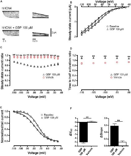 FIGURE 1. HCN4 channel function is reduced by GBP. (A) Raw HCN4 channel-mediated steady-state (left) and tail currents (right) before and after GBP. (B) Average steady-state current before and after GBP. (C) Average 100 μM GBP to vehicle steady-state current ratio at various voltages. (D) Average 100 μM GBP to vehicle time to half-activation ratio at various voltages. (E) Normalized conductance–voltage relationship constructed from tail currents. (F) Average shift (Δ) in the voltage of half-activation and slope of HCN4 channel by 100 μM GBP and vehicle control, relative to baseline measurements. ∗∗p < 0.0001.