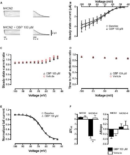 FIGURE 3. HCN2 channels are unaffected by GBP. (A) Raw HCN2 channel-mediated steady-state (left) and tail currents (right) before and after 100 μM GBP. (B) Average steady-state current before and after GBP. (C) Average 100 μM GBP to vehicle steady-state current ratio at various voltages. (D) Average 100 μM GBP to vehicle time to half-activation ratio at various voltages. (E) Normalized conductance–voltage relationship constructed from tail currents. (F) Average shift (Δ) in the voltage of half-activation and slope of HCN2 and HCN2+4 channels by 100 μM GBP and vehicle control, relative to baseline measurements.