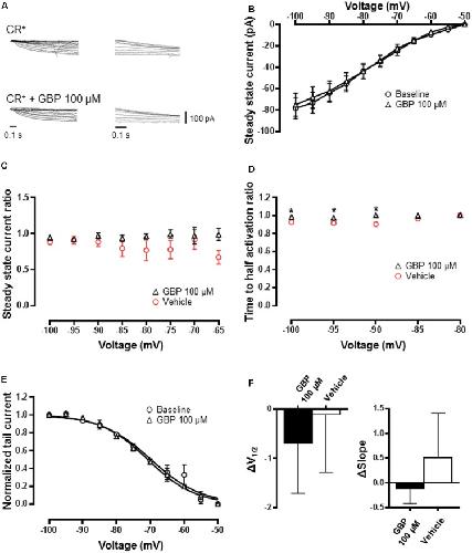 FIGURE 2. HCN1 channels are minimally affected by GBP. (A) Raw HCN1 channel-mediated steady-state (left) and tail currents (right) before and after 100 μM GBP. (B) Average steady-state current before and after GBP. (C) Average 100 μM GBP to vehicle steady-state current ratio at various voltages. (D) Average 100 μM GBP to vehicle time to half-activation ratio at various voltages. (E) Normalized conductance–voltage relationship constructed from tail currents. (F) Average shift (Δ) in the voltage of half-activation and slope of HCN1 channel by 100 μM GBP and vehicle control, relative to baseline measurements.∗p < 0.05.