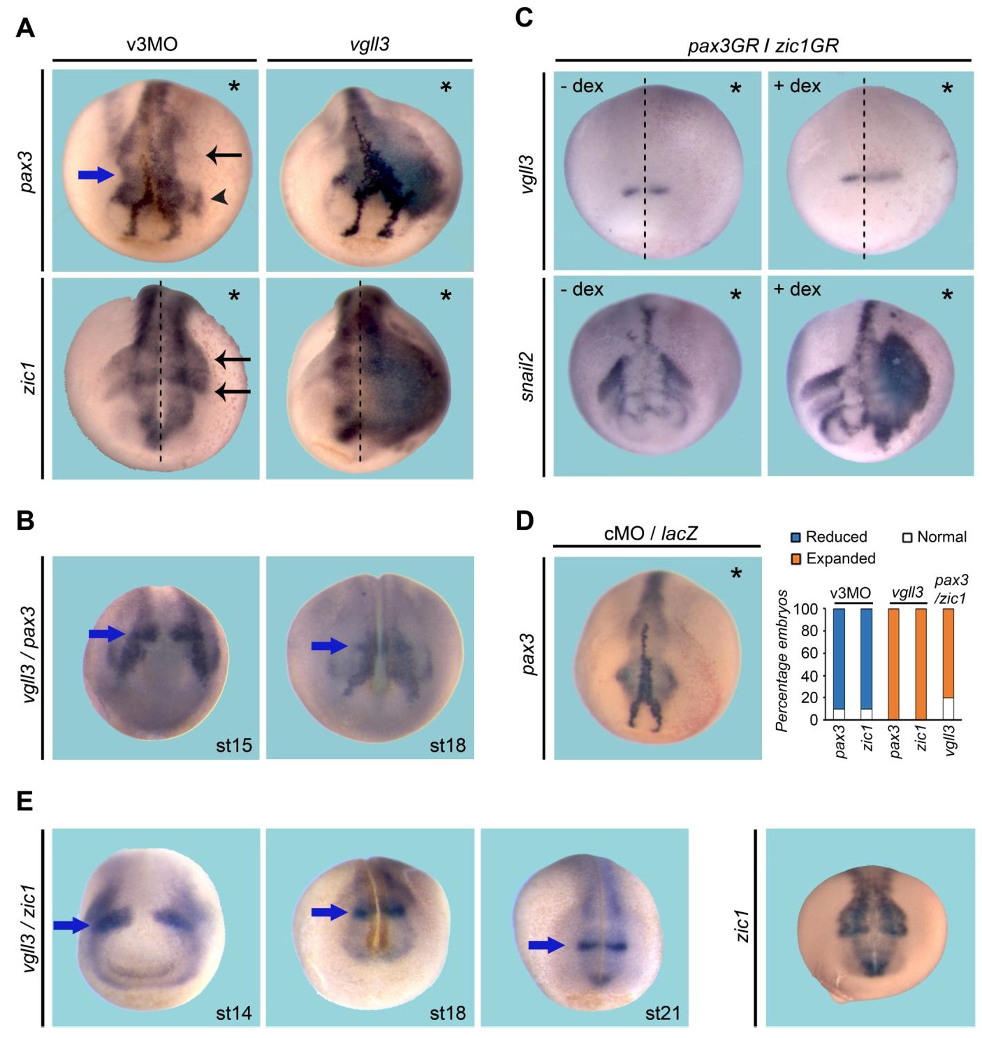 Fig. 3. Vgll3 stimulates pax3 and zic1 expression. (A) Embryos were injected with v3MO or vgll3 mRNA and analysed at stage 19 for pax3 and zic1 expression. Defects of CNC lateral streams and trigeminal placode are shown by arrows and arrowhead respectively. (B) ISH for vgll3 and pax3 shows overlapping expression at the r2 level (blue arrow). (C) Stage 19 embryos injected with pax3GR/zic1GR mRNAs show a faint vgll3 and a strong snail2 expression after dexamethasone treatment (+dex). (D) cMO/LacZ mRNA control and quantification. Three independent experiments were performed (n=40). (*), injected side. All views are dorsal-anterior. A dotted line indicates the midline embryo. (E) ISH for vgll3 and zic1 shows overlapping expression at the r2 level (blue arrow). Zic1 expression in stage 21 embryo. |