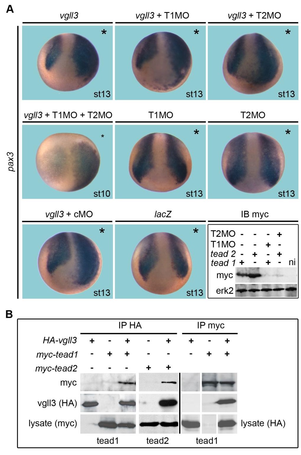 Fig. 7. Vgll3 interacts with tead proteins and can activate pax3 independently of tead. (A) Embryos injected with vgll3 (1ng or lacZ) mRNA and T1MO/T2MO or cMO were fixed at stage 10 or 13 and analysed for pax3. Vgll3 induces ectopic pax3 expression when tead1 and tead2 have been knocked down. Lower right panel (IB myc): embryos were injected with 50 pg of myc-tead1 or myc-tead2 mRNAs with 15 ng of T1MO or T2MO and analysed by IB. T1MO and T2MO block efficiently tead1 and tead2 expression respectively. Erk2 is used as control. ni: non injected embryo. (B) Embryos injected with HA-vgll3, myc-tead1 or myc-tead2 mRNAs were processed for immunoprecipitation with HA (IP HA) or myc antibodies (IP myc) followed by IB with antibodies. Vgll3 interacts with tead1 and tead2 in the embryo. Lysate, IB of injected embryo before immunoprecipitation. Vertical white lines indicate spliced images in order to remove results not described in this paper (IP myc). |