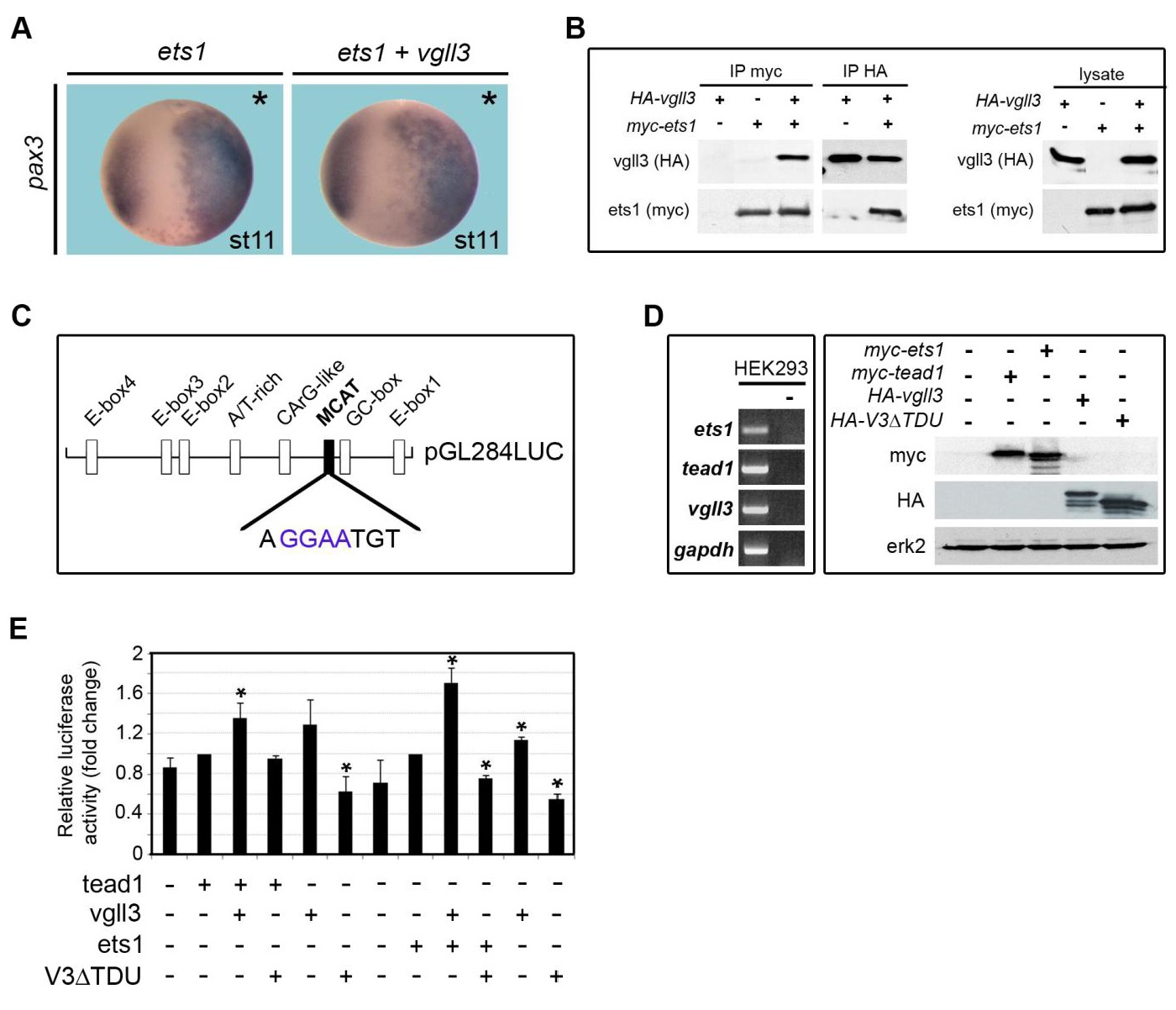 Fig. 8. Vgll3 interacts with ets1 and activates a tead-dependent luciferase reporter gene. (A) Pax3 expression in embryos injected with vgll3 or ets1 mRNA. Ets1 overexpression induces ectopic pax3 expression likewise co-expression of ets1 and vgll3. (*), injected side. (B) Embryos were injected with myc-ets1 or HA-vgll3 mRNAs. Immunoprecipitation with myc (IP myc) or HA antibodies (IP HA) was followed by IB with antibodies. (C) Schematic representation of the pGL284LUC reporter plasmid used in transfection assay. The different cis-sequences are depicted together with the MCAT cis-sequence (black box). (D) Left panel: ets1, tead1 and vgll3 are expressed in HEK293 cells when analysed by RT-PCR. (-), no cDNA. Right panel: HEK293 cells were transfected with HA-vgll3, HA-V3δTDU, myctead1 or myc-ets1 plasmids and similar amounts of proteins were checked by IB with myc and HA antibodies. Gapdh and erk2 are used as control. (E) HEK293 cells were co-transfected with pGL284LUC and HA-vgll3, HA-V3δTDU, myc-tead1 and mycets1 plasmids. Relative luciferase activity is expressed as x-fold luciferase activity compared to tead1 or ets1 alone. Bars show mean±s.e.m. of three independent experiments carried out in duplicate. *P value <0.05. |