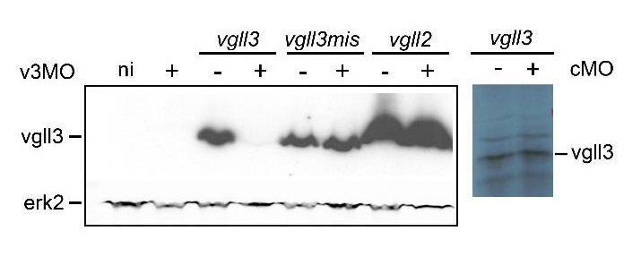 Figure S2. In vivo specificity of vgll3 morpholinos. Embryos were injected with 500pg of vgll3, vgll3 mismatch (mis) or vgll2 mRNAs in the presence (+) or not (-) of 40 ng of vgll3 (v3MO) or control (cMO) morpholino oligonucleotide antisenses. Stage 15 embryos were stopped and analysed by immunoblotting with HA antibody to detect vgll3. v3MO efficiently blocks the translation of vgll3 mRNA but has no effect on vgll3 mismatch mRNA neither on vgll2 mRNA. Erk2 is used for loading controls. Right panel, control MO (cMO) has no effect on vgll3 mRNA translation in an in vitro translation assay. |