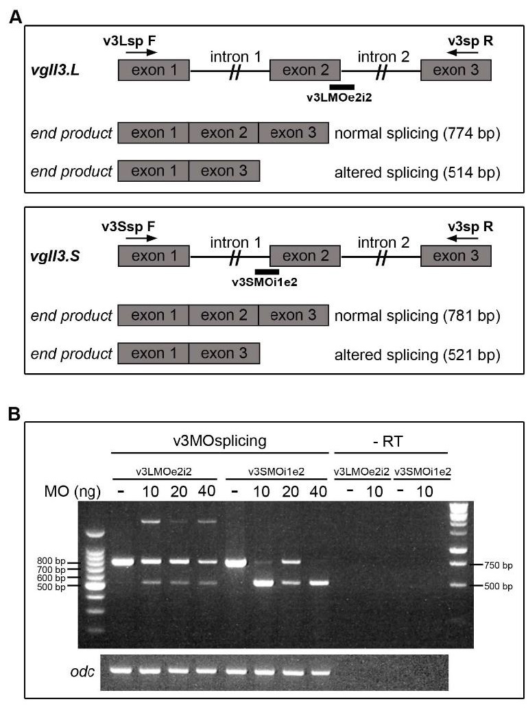 Figure S3. In vivo specificity and efficiency of v3MOsplicing. (A) Schematic representation of the vgll3 locus. There are two vgll3 homeolog genes, vgll3.L and vgll3.S, that are expressed in Xenopus laevis. Specific primers for vgll3.L and vgll3.S (v3Lsp F and v3Ssp F respectively) and common primer for both mRNAs (v3sp R) were chosen to detect normal and altered splicing for vgll3.L and vgll3.S mRNAs. The position of the splicing blocking MO specific to vgll3.L pre-mRNA (v3LMOsp for v3LMOe2i2) or to vgll3.S pre-mRNA (v3SMOsp for v3SMOi1e2) is indicated by a black box. (B) Embryos were co-injected with 10, 20 or 40 ng of each morpholino splicing (v3MOsplicing) and gfp mRNA as lineage tracer. Stage 15 embryos were analysed by RT-PCR to detect vgll3 expression. V3MOsplicing decreases normal spliced vgll3.L RNA or vgll3.S level compared to non-injected embryos in a dose-dependent manner. PCR fragments corresponding to the altered splicing mRNAs appeared at expected size for both vgll3 mRNAs. Odc is used for loading controls.-RT, no DNA for each condition. |