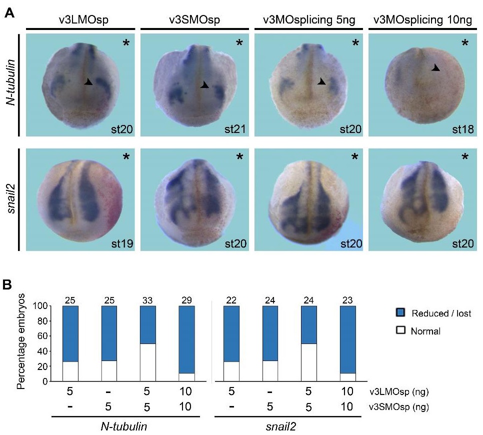 Figure S4. Dose dependent effect of v3MO splicing on N-tubulin and snail2 expression domain. (A) Embryos injected with v3LMOsp, specific to vgll3 form L or v3SMOsp, specific to vgll3 form S or both (v3MOsplicing) exhibit a reduced expression of N-tubulin in the trigeminal placodes (arrowhead) and an inhibition of CNC migration as shown snail2 expression. Stronger effect was observed when both splicing MOs were injected at 10ng each compared to single MO. Injected side (*) was traced by lacZ staining. Gene expression was assayed by ISH. Arrowhead indicates the trigeminal placodes. (B) Quantification of results. Three independent experiments were performed. The number of embryos analysed is indicated on the top of each bar. All views are dorsal-anterior. sp, splicing. |