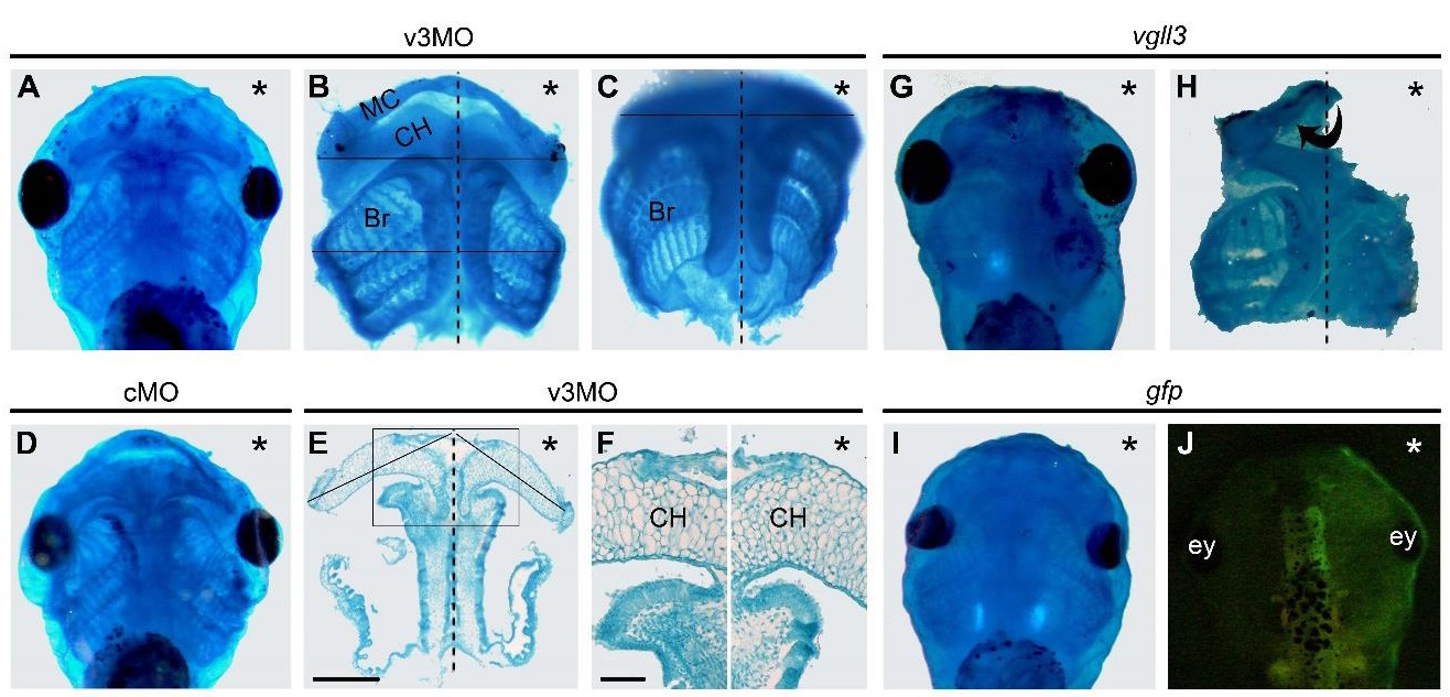 Figure S7. Vgll3 is required for the formation of neural crest derivatives. Embryos were injected with 40 ng of v3MO (or cMO) or 1 ng of vgll3 mRNA (or gfp mRNA) and fixed at stage 47 before alcian blue staining (A-I). (A, B, C, D) The formation of cranial cartilage is impaired when vgll3 is knocked-down when compared to control MO injected embryo [A compared to D (embryos injected with cMO show no alteration)]. This is more obvious on dissected embryos that revealed on the injected side a high rate of cranial cartilage hypoplasia including severe loss of Meckelâs (MC), ceratohyal (CH) and branchial cartilages (Br) (100%, n=15, Fig. 6B,C). (E, F) Transversal sections of paraffin embedded tissues showed that the ceratohyal cartilage on the injected side was shorter than on the uninjected control side (Fig. 6E) and displayed numerous smaller chondrocytes (Fig. 6F, enlarged view of E indicated in the square line. Scale bars represent 500 μm (E) and 130 μm (F). (G, H, I, J) Embryos injected with vgll3 mRNA showed an impaired cartilage development with the ceratohyal cartilage being severely disorganized (100%, n=15, Fig. 6G, H). In control experiments, embryos injected with gfp mRNA showed no change in cartilage head morphology (Fig. 6I, J). ey, eye. Ventral views with anterior to the top (A, D, G, I) and dorsal views (J). (*) injected side. Midline embryo is indicated by a dotted line. |