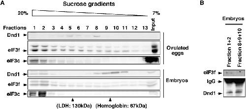 Fig. 5. Interaction between endogenous Dnd1 and eIF3f in Xenopus embryos. (A) Egg or embryo extracts were fractionated on 7-20% sucrose gradients. Gradient fractions were blotted with antibodies for Dnd1, eIF3f and eIF3c proteins. Experiments were repeated four times. (B) Fractions 1+2 and fractions 8+9+10 of embryo extracts from the sucrose gradients were pooled and immunoprecipitated with an anti-Dnd1 antibody. Endogenous eIF3f and Dnd1 proteins were monitored by western blot. Experiments were repeated three times. |