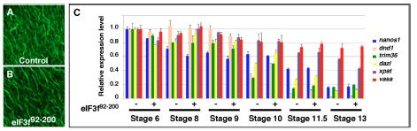 Figure S4. Overexpression of eIF3f92-200 has no effect on formation of the vegetal cortical microtubule arrays during cortical rotation and degradation of germline specific RNAs during gastrulation. (A) and (B) Confocal images showing formation of microtubule arrays in the vegetal cortex in artificially activated eggs. Control (A) and eIF3f92-200 (4 ng) overexpressed oocytes (B) were treated with progesterone to induce maturation, pricked with a glass needle after GVBD, harvested at 55 minutes post egg activation, and stained with an anti-Tubulin antibody. (C) Real-time PCR results show the expression of nanos1, dnd1, trim36, dazl, Xpat, and vasa in control and eIF3f92-200 overexpressed embryos. |