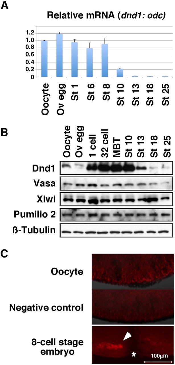 Fig. 2. Dnd1 expression pattern. (A) RT-PCR shows the expression of dnd1 RNA during early development. The experiment was performed twice. (B) Western blot showing expression of germline proteins during development. β-Tubulin was used as a loading control. Dnd1 was enriched by IP from 50 oocytes or embryos before western blotting. All other proteins were detected using protein extracts from the equivalent of one-eighth of an oocyte or embryo. The experiment was repeated three times. (C) Representative IF images show localization of endogenous Dnd1 protein (red) in an oocyte (top, n=7) and an 8-cell-stage embryo (bottom, n=7). A dnd1 knockdown oocyte (AS-oligo injected) served as a negative control for the specificity of Dnd1 staining (middle, n=10). Oocytes and embryos were hemi-sectioned. Images show the vegetal pole of oocytes or embryo. Asterisk marks the cleavage furrow of the embryo. Arrowhead indicates the germ plasm. Ov, ovulated; St, stage. |