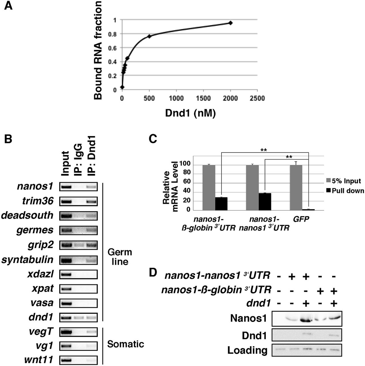 Fig. 3. Dnd1 binds nanos1 RNA. (A) Double-filter nucleic acid-binding assay shows that recombinant Dnd1 protein binds nanos1 RNA. The experiment was repeated twice. (B) RIP assay followed by RT-PCR shows that endogenous Dnd1 protein selectively binds a subset of germline RNAs in stage 7 embryos. The experiment was performed three times. (C) RNAs were pulled down by GST-Dnd1 and measured by qPCR. Ratio between the pull down and 5% of RNA input is shown. GFP served as a negative control. Data are shown as mean±s.d. **P<0.01. The experiment was repeated four times. (D) nanos1-nanos1 3′UTR and nanos1-β-globin 3′UTR were injected into stage VI oocytes with or without dnd1 mRNA. Nanos1 protein was immunoprecipitated and analyzed by western blot for Nanos1 and Dnd1. The experiment was repeated twice. |