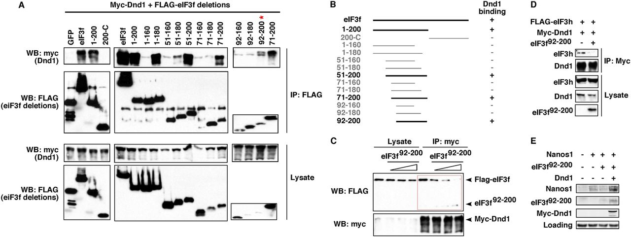 Fig. 6. Interaction between Dnd1 and eIF3f is essential for nanos1 translation. (A) FLAG-tagged eIF3f deletions were transfected into HEK293T cells along with myc-Dnd1. Lysates were immunoprecipitated with anti-FLAG antibody and analyzed by western blot. The minimal Dnd1-binding domain was mapped to residues 92-200 of eIF3f, which is indicated by the red asterisk. (B) Schematic summarizing experiments shown in A. +, Dnd1 binding; â, lack of Dnd1 binding. (C) Myc-Dnd1 and FLAG-eIF3f were transfected into HEK293T cells with increasing amounts of eIF3f92-200. Cell lysates were immunoprecipitated with an anti-myc antibody and analyzed by western blot. (D) Myc-Dnd1 and FLAG-eIF3h were transfected into HEK293T cells in the presence or absence of eIF3f92-200. Cell lysates were immunoprecipitated with an anti-myc antibody and analyzed by western blot. Experiments were repeated three times. (E) nanos1 RNA was injected into fertilized eggs alone or with eIF3f92-200, or with eIF3f92-200 and myc-dnd1 RNAs. At stage 11, Nanos1 protein was immunoprecipitated and analyzed by western blot. Non-specific band served as a loading control. The experiment was performed twice. |