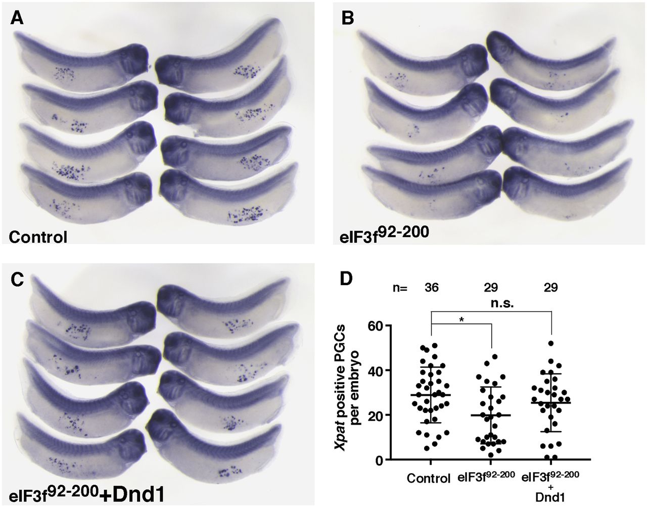 Fig. 7. Interfering with the interaction between Dnd1 and eIF3f disrupts PGC development. (A-C) In situ hybridization of stage 33 embryos showing Xpat-expressing PGCs in uninjected control (A), eIF3f92-200-injected (B) and eIF3f92-200+dnd1-injected (C) embryos. Experiments were repeated three times. (D) Quantification of results shown in A-C. Two-tailed t-tests were performed. *P<0.05; n.s., non-significant. |