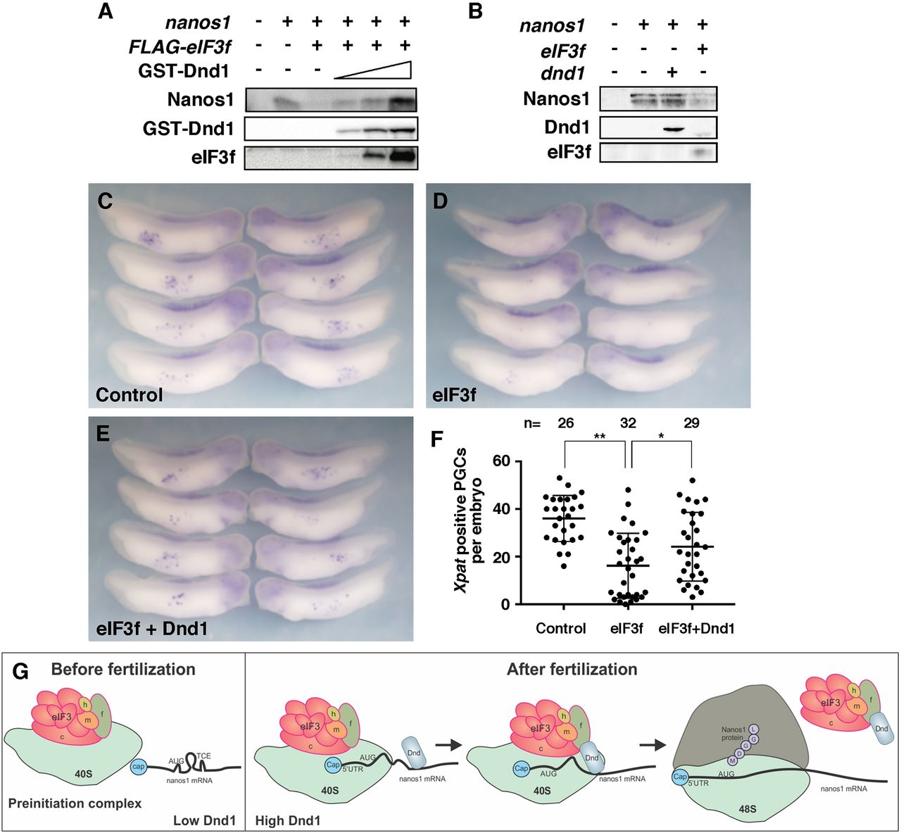 Fig. 8. Dnd1 relieves the inhibitory effect of eIF3f on nanos1 translation and PGC development. (A) nanos1 (4â ng) was translated alone or with FLAG-eIF3f (2â ng) in wheat germ extracts with enhanced translational efficiency (Promega WG+). Nanos1 protein was detected by western blot. eIF3f inhibited nanos1 translation. Addition of recombinant Dnd1 protein relieved the repressive activity of eIF3f in a dose-dependent manner. The experiment was repeated three times. (B) eIF3f represses nanos1 translation in vivo. nanos1 RNA was injected into fertilized eggs alone, or together with eIF3f or dnd1 RNA. At stage 11, Nanos1 protein was immunoprecipitated and analyzed by western blot. Experiments were performed twice. (C-E) In situ hybridization of stage 33 embryos showing PGCs by Xpat staining in uninjected control (C), eIF3f-injected (D) and eIF3f+dnd1-injected (E) embryos. Experiments were repeated three times. (F) Quantification of results shown in C-E. Two-tailed t-tests were performed. *P<0.05, **P<0.01. (G) Working model of Dnd1 function in regulating nanos1 translation. Before fertilization, very little Dnd1 protein is present. Translation of nanos1 RNA is blocked by TCE, a secondary structure within the ORF that prevents the preinitiation complex (PIC) from scanning and initiating translation. After fertilization, Dnd1 protein accumulates within the germ plasm and there binds to nanos1 RNA, altering the TCE structure. The PIC can now scan the nanos1 RNA. Meanwhile, Dnd1 binds with the eIF3 complex through the interaction with subunit eIF3f. This interaction blocks the repressive activity of eIF3f and promotes the translation of nanos1 RNA. The eIF3-Dnd1 complex is released from the 40S ribosomal subunit as translation proceeds. |