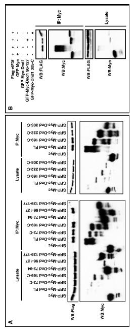 Figure S2. Mapping the eIF3f-binding domain of Dnd1. Because some Dnd1 deletion constructs are poorly expressed, we fused Dnd1 and deletions to GFP-Myc. These constructs were transfected into HEK293T cells together with FLAG-eIF3f. Lysates wereimmunoprecipitated with anti-Myc antibody and analyzed by Western blot. (B) CoIP to confirm that eIF3f interacts with Dnd196-127 and Dnd1305-C. |