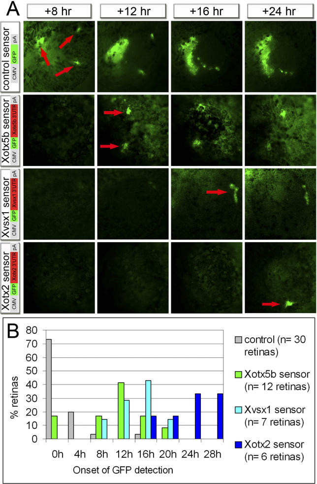 Figure 4. The 3â² UTRs of Xotx5b, Xvsx1, and Xotx2 mRNAs Direct Time-Dependent Inhibition of Translation(A) Examples of time-lapse imaging of lipofected retinas. Times are calculated starting from st. 30 [22] (which corresponds to time 0). To better visualize GFP, pigmentation was abolished as described [43]. Each micro-photograph shows the entire area of a lipofected eye and is focused on lipofected cells of the neural retina. Red arrows point to lipofected clones of cells.(B) Statistical analysis of 68 records. Bars express the proportion of lipofected retinas in which GFP was first detectable at a given time. Number of retinas examined is indicated by n. |