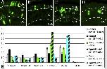 Figure S5. LI Analysis (A and B) Analyses of the BrdU-LI (the proportion of BrdU-labeled cells) in wild-type (wt) (A) and lipofected (B) retinas. BrdU was injected and detected as described [19,31]. Images in (A) show examples of retinal sections of wt embryos, after different times of BrdU in incorporation (h BrdU) starting from st. 30 and st. 34. White lines demarcate the central retinal region that was considered for quantitative analysis. BrdU-positive nuclei are detectable in green among DAPI-stained (blue) nuclei. L: lens. Images in (B) show magnifications of retinas (bordered by dashed lines) lipofected at st. 17 with cdk2/cyclinA2 (cdk/cyc [18]), or with XE2F [42], after BrdU cumulative incorporation from st. 34. White arrows point at BrdU-positive nuclei (detectable in red) of lipofected cells (detectable in green). Histograms show the percentage of BrdU-immunopositive cells among DAPI-positive cells (A), or lipofected cells (B), after cumulative BrdU incorporation; h indicates the time of incorporation (in hours); n reports the total number of cells counted; and error bars show standard error of the mean. Diagrams show the linear function used to calculate the length of the cell cycle, according to Takahashi et al. [39]; abscissae indicate time (in hours); ordinates show LI of wt (A) or lipofected (B) cells; and Tc and Ts estimate the duration in hours of cell cycle and S phase, respectively. Tc and Ts of control-lipofected cells (not shown) are virtually the same as those of st. 34 wt cells. In wt retinas, the proportion of cycling cells, expressed as 10 h LI, is higher at st. 30 (32% ± 0.34% standard error of the mean) than at st. 34 (23% ± 0.1% standard error of the mean). This proportion, at st. 34, is even higher in cdk2/cyclinA2âlipofected cells (45% ± 0.1% standard error of the mean) and in XE2F-lipofected cells (48% ± 2% standard error of the mean), which both delay the exit from the cell cycle. In wt retinas, the average cell cycle length, as evaluated by Tc value, increases from st. 30 (Tc = 5.1 ± 1.3 h) to st. 34 (Tc = 8.1 ± 0.6 h). Notably at st. 34, XE2F lipofection significantly reduces Tc (Tc = 5.5 ± 1.2 h) compared to control cells of the same age (Tc = 8.1 ± 0.6 h), whereas Tc is not significantly affected by cdk2/cyclinA2 lipofection (Tc = 7.8 ± 0.9 h). The changes in Tc observed among different types of cells are poorly affected by Ts, which ranges from 0.9 to 1.4. https://doi.org/10.1371/journal.pbio.0040272.sg005 |