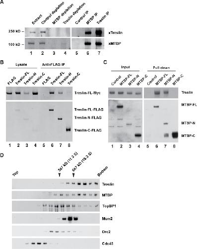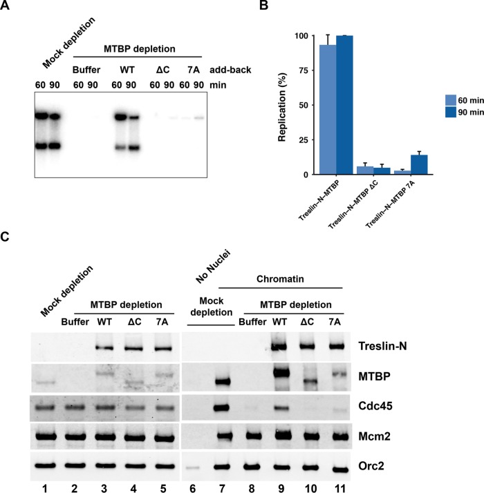 Treslin, which is essential for incorporation of Cdc45 into the replicative helicase, possesses a partner called MTBP (Mdm2-binding protein). We have analyzed Xenopus and human MTBP to assess its role in DNA replication. Depletion of MTBP from Xenopus egg extracts, which also removes Treslin, abolishes DNA replication. These extracts be can rescued with recombinant Treslin-MTBP but not Treslin or MTBP alone. Thus, Treslin-MTBP is collectively necessary for replication. We have identified a C-terminal region of MTBP (the CTM domain) that binds efficiently to both double-stranded DNA and G-quadruplex (G4) DNA. This domain also exhibits homology with budding yeast Sld7. Mutants of MTBP without a functional CTM domain are defective for DNA replication in Xenopus egg extracts. These mutants display an impaired localization to chromatin and the inability to support loading of Cdc45. Human cells harboring such a mutant also display severe S-phase defects. Thus, the CTM domain of MTBP plays a critical role in localizing Treslin-MTBP to the replication apparatus for initiation.