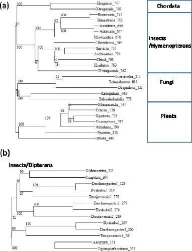 Fig. 1. Phylogenetic trees of TPX2 homologs. a Phylogenetic tree of full length orthologs of TPX2 in representative species. b Phylogenetic tree of short orthologs of TPX2 in representative dipteran species. Drosophila has three paralogs. The labels indicate species and length of the protein. Numbers in the tree represent bootstrapping values. The sequences and NCBI identifiers are available as Additional file 1 and Additional file 3 for (a) and (b), respectively. The multiple sequence alignments used to do the phylogenetic trees are available as Additional file 2 and Additional file 4 for (a) and (b), respectively