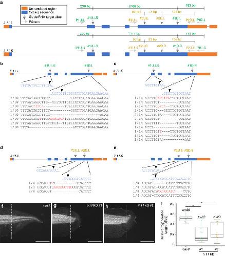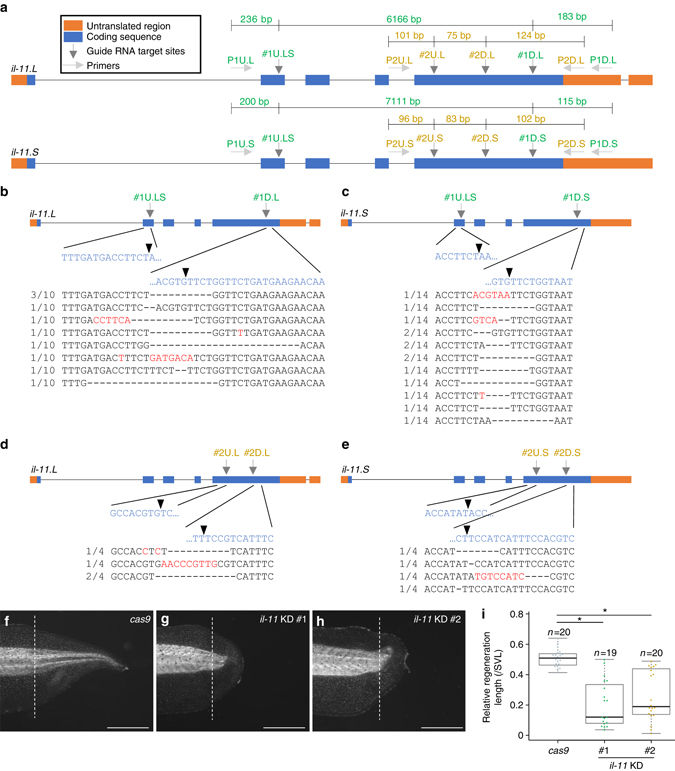 Figure 2. Knockdown of il-11 in tadpoles. a Schematic drawing of genomic structure of il-11. Bars: introns, orange boxes: untranslated regions, blue boxes: coding sequences, dark grey vertical arrows: gRNA target sequences, light grey horizontal arrows: primers. bâe, Genomic sequences of tadpoles injected with cas9 mRNA and gRNAs. Genomic DNA was extracted from all body of il-11 KD #1 tailbud embryos b, c or tail of il-11 KD #2 tadpoles d, e, and sequences corresponding to il-11.L b, d or il-11.S c, e were PCR-amplified using P1U.L/P1D.L b, P1U.S/P1D.S c, P2U.L/P2D.L d, or P2U.S/P2D.S e primers. The PCR product of the expected length corresponding to deletion of the region between two gRNA target sites was sequenced. Blue characters: reference genomic sequences nearby gRNA target sites, red characters: mismatches from reference genomic sequences, bars: gaps, arrowheads: predicted cleavage sites. Numbers at the left corner indicates ratio of clones containing the sequence to total clones sequenced. fâi, Representative images of tails of control cas9 mRNA-injected f, il-11 KD #1 g, or il-11 KD #2 h tadpoles at 7âdpa, and the tail regeneration length i are shown. Dark-field images fâh are shown. Anterior is to the left, dorsal is up. White broken lines indicate amputated plane. Scale bars: 1âmm. Regeneration length was normalised by snout to vent length (SVL). Box plots are inserted in the panels. Bars in the boxes represent median, upper and lower limits of the boxes represent the first and third quartiles, and whiskers represent maximum and minimum values. *Pâ<â0.05, Dunnettâs test |