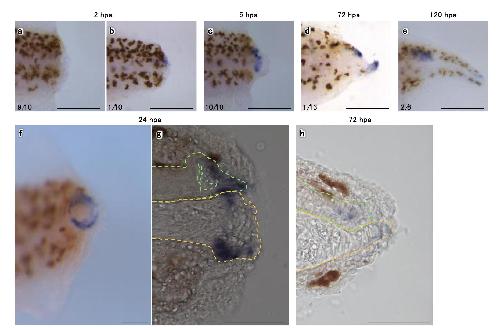 Supplementary Figure 1 Detailed localisation analysis of il-11 after tail amputation. a-e, WISH images for il-11 that are not shown in Fig. 1. Representative images of tadpoles fixed at 2 (a and b), 5 (c), 72 (d), or 120 hpa (e) are shown. f, Posterior view of a tadpole fixed at 24 hpa. g, h, Sagittal section of tadpoles fixed at 24 (g) or 72 (h) hpa. Anterior is to the left and dorsal is up in side view or sagittal section images. Dorsal is up in the posterior view. Blue/purple colour represents signals for il-11 expression. Brown pigments are melanophores of the tadpoles. Scale bars: 500 μm (a-e) or 100 μm (f-h). Numbers at the bottom corner are the total ratio of tadpoles showing the corresponding expression pattern from at least 2 batches. Green broken lines indicate spinal cord and spinal cord ampulla, and yellow broken lines indicate notochord and notochord bud. |