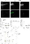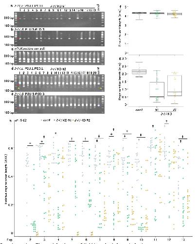 Supplementary Figure 4 Analyses of il-11 knocked-down tadpoles. a-e, Genotyping of tadpoles used in Fig. 2i. Genomic DNA was extracted from tail stump tissues cut at the level 0.5 mm anterior from the amputated plane after measurement of regeneration length, and sequences corresponding to il-11.L (a, d), il-11.S (b, e), or positive control ef1a (c) were PCR-amplified. Individual identification numbers are indicated on top. Sizes of DNA markers were (from bottom to top) 100, 200, 300, 400, 500, 600, 700, 800, 900, 1000, 1500, and 3000 bp. If the genomic region between two gRNA target sites is deleted, a band will be detected as indicated by the red arrowhead. Blue arrowheads correspond to wild-type sequences. Yellow asterisks: non-specific bands. f, g, Snout to vent length (SVL, f) and regeneration length (g) used for calculation in Fig. 2i are shown. h, Biological replicates for Fig. 2i are shown. Different batches of tadpoles were used in each experiment (Exp.). Box plots are inserted in the panels. Bars in the boxes represent median, upper and lower limits of the boxes represent the first and third quartiles, and whiskers represent maximum and minimum values. â P < 0.05, Studentâs t-test. â P < 0.05, Dunnettâs test. NA: not analysed. |