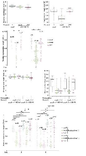 Supplementary Figure 5 Analyses of il-11 forced expressed il-11 knocked-down tadpoles. a, b, d, e, Snout to vent length (SVL, a, d) and regeneration length (b, e) used for calculation in Fig. 3j (a, b) or Fig. 3x (d, e) are shown. c, f, Biological replicates for Fig. 3j (c) or Fig. 3x (f) using different batches of tadpoles are shown. Box plots are inserted in the panels. Bars in the boxes represent median, upper and lower limits of the boxes represent the first and third quartiles, and whiskers represent maximum and minimum values.*P < 0.05, Tukey-Kramerâs test. |