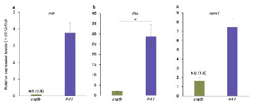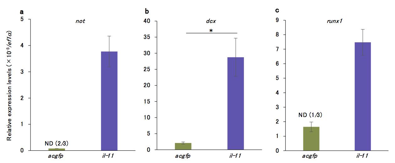 Supplementary Figure 10 Gain of function analysis of il-11 for expression of undifferentiated markers. Biological replicates for Fig. 6h-j using tadpoles from a different batch. Expression levels of not (a), dcx (b), or runx1 (c) were measured by qRT-PCR. Four to six tadpoles were used in each lot. Vertical axes represent relative expression levels normalised by those of ef1α. Mean ± s.e.m. n=3. *P < 0.05, Studentâs t-test. RT-PCR signal for not (a) or runx1 (c) was not detected in two or one samples in acgfp-expressing tails due to low expression levels. |