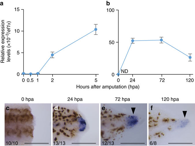 Figure 1. il-11 is expressed at the tip of blastema during tail regeneration. a, b Expression levels of il-11 were measured by qRT-PCR using RNA extracted from ~20 tadpoles. Tail stump tissues cut at the level of 0.5âmm anterior from the amputated plane were used. Vertical axes represent relative expression levels of il-11 normalised by those of ef1α. Meanâ±âs.e.m. nâ=â4. ND: not detected. câf WISH was performed using tadpoles fixed at 0 c, 24 d, 72 e, or 120âhpa f. Anterior is to the left and dorsal is up. Blue/purple colour represents signals for il-11 expression. Brown pigments are melanophores of the tadpoles. Scale bars: 500âμm. Numbers at the bottom corner indicate the total ratio of tadpoles showing the corresponding expression pattern from at least two batches. Note that il-11 was expressed at the blastema tip at 72 and 120âhpa (black arrowheads) |